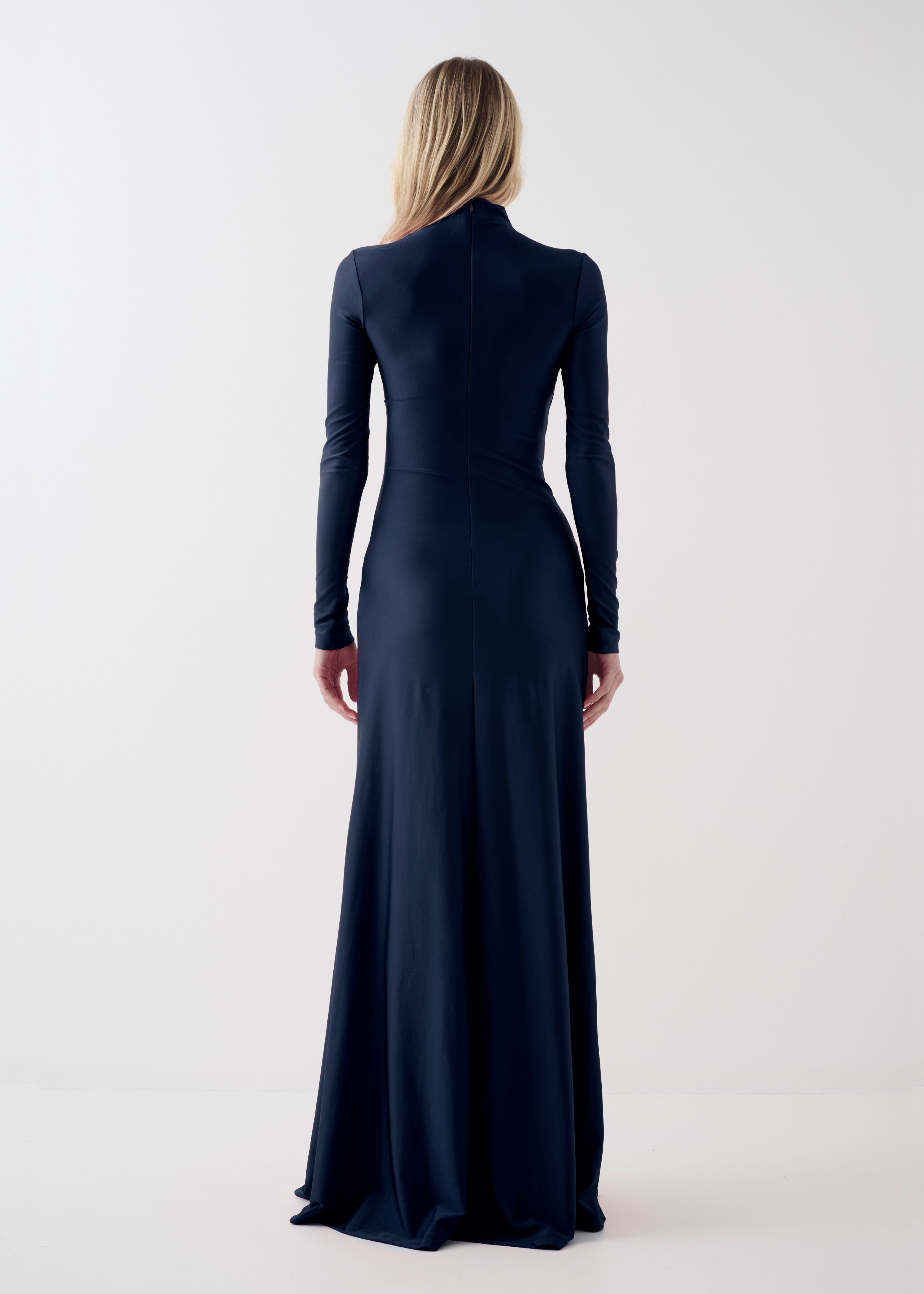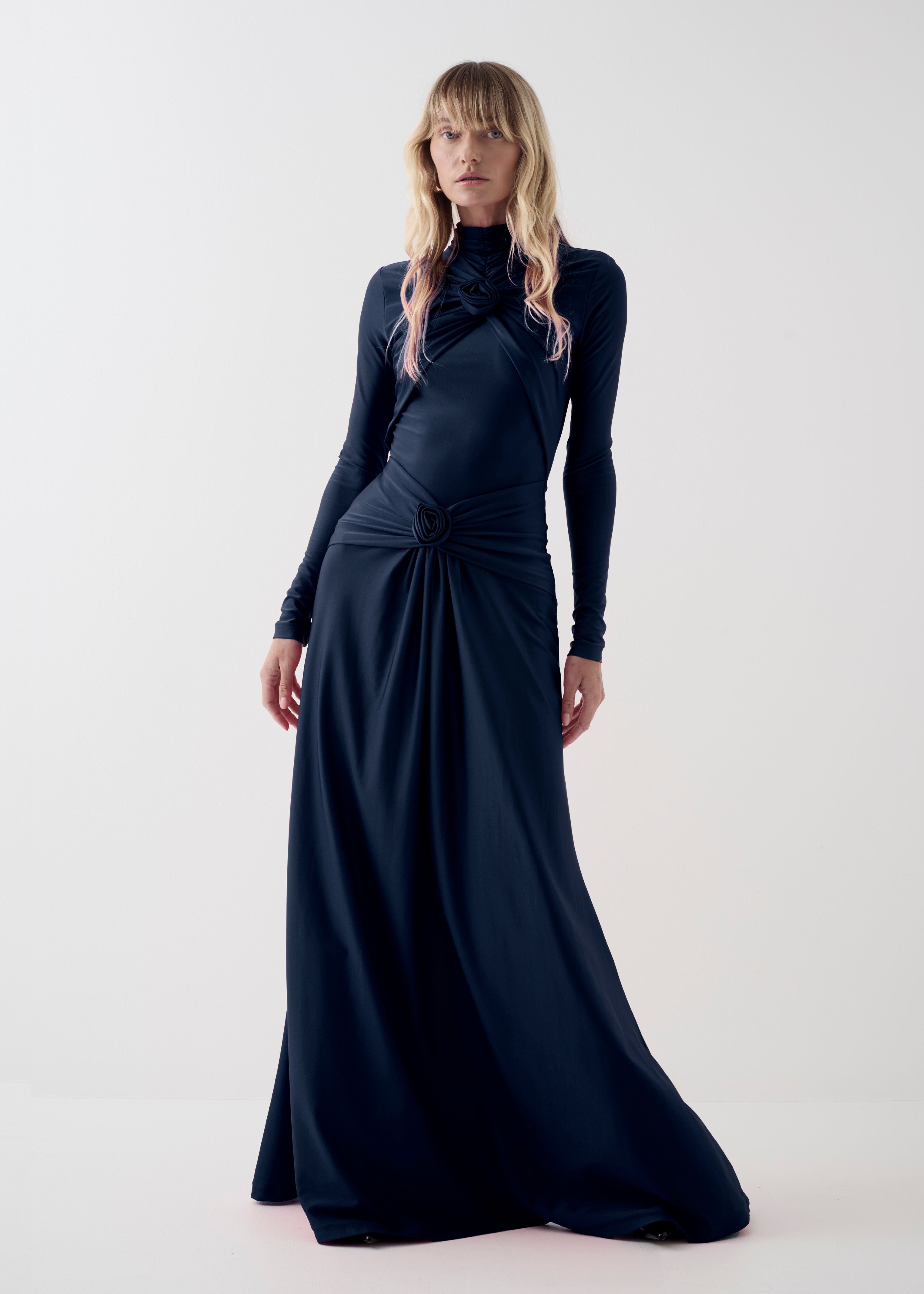 Drama exudes in this dress where feminine rosettes are set off against form enhancing ruching in a high sheen Italian midnight blue material for octane value. Minimal finishings at back to keep lines elongated and clean with concealed back zip.