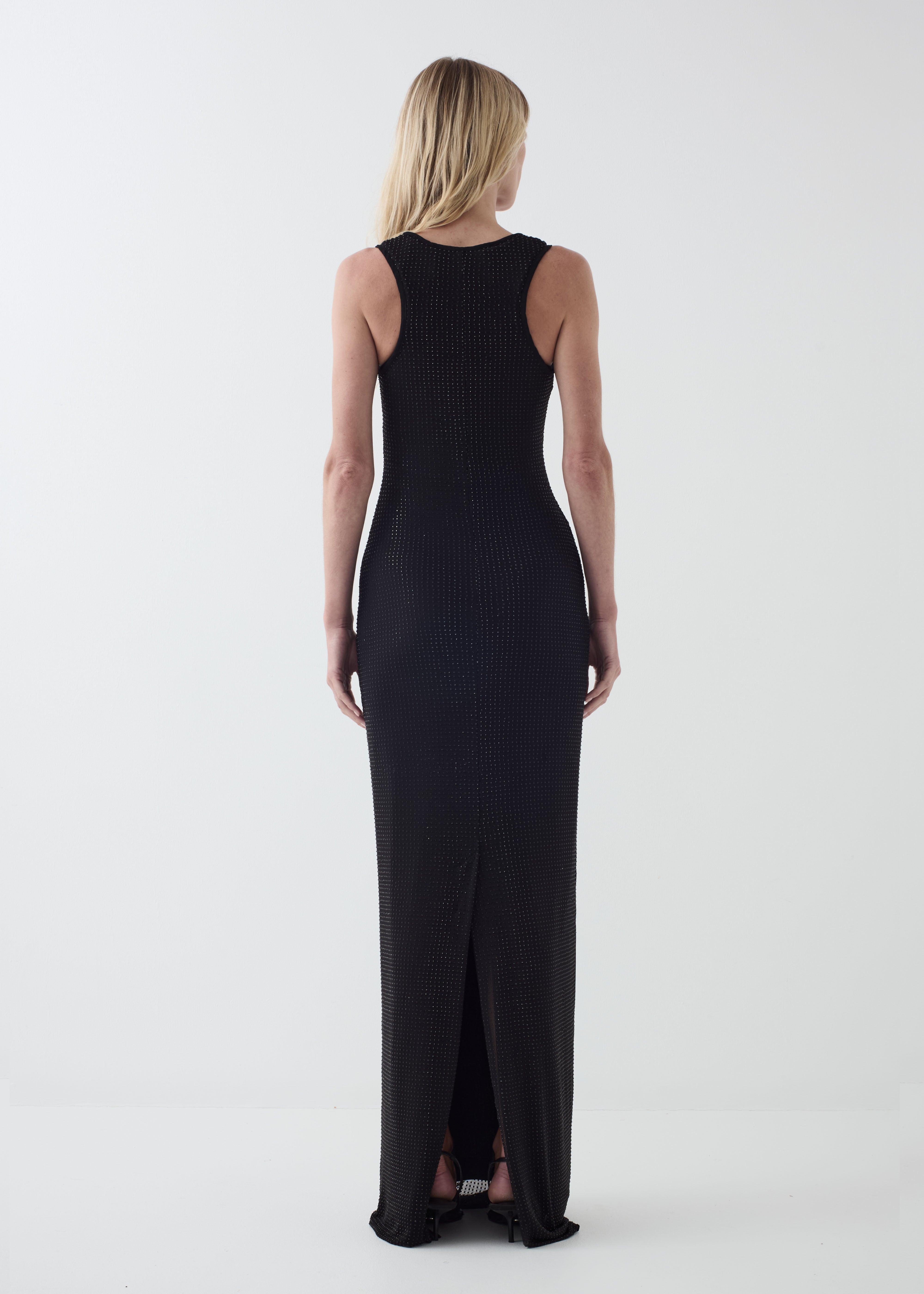 A sheer black dress in luminous crystal mesh, defined by a low, plunging neckline and fluid, body-skimming lines. Designed to be layered over the Cameron Dress for an elegant evening look, or worn alone for a more daring expression.