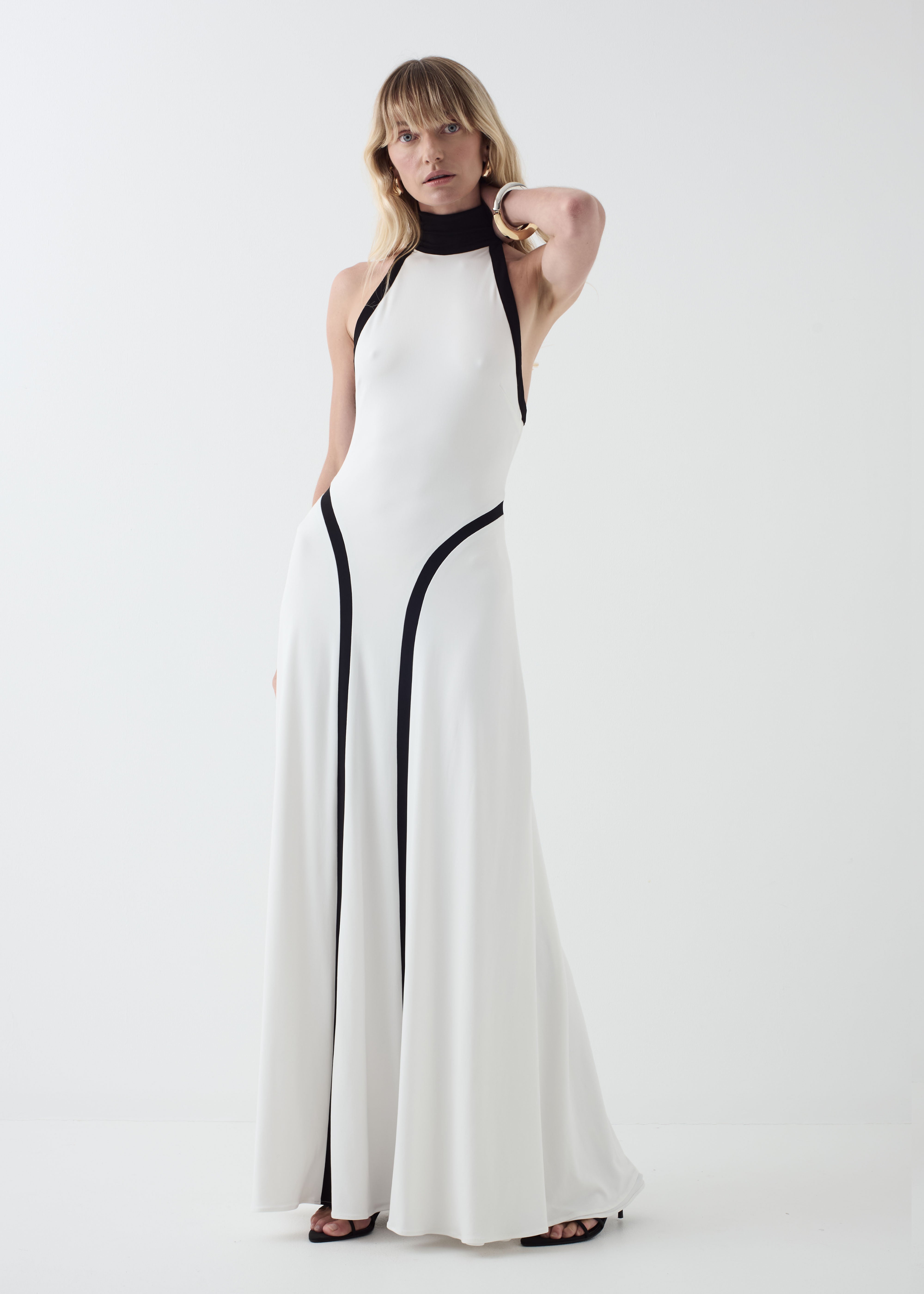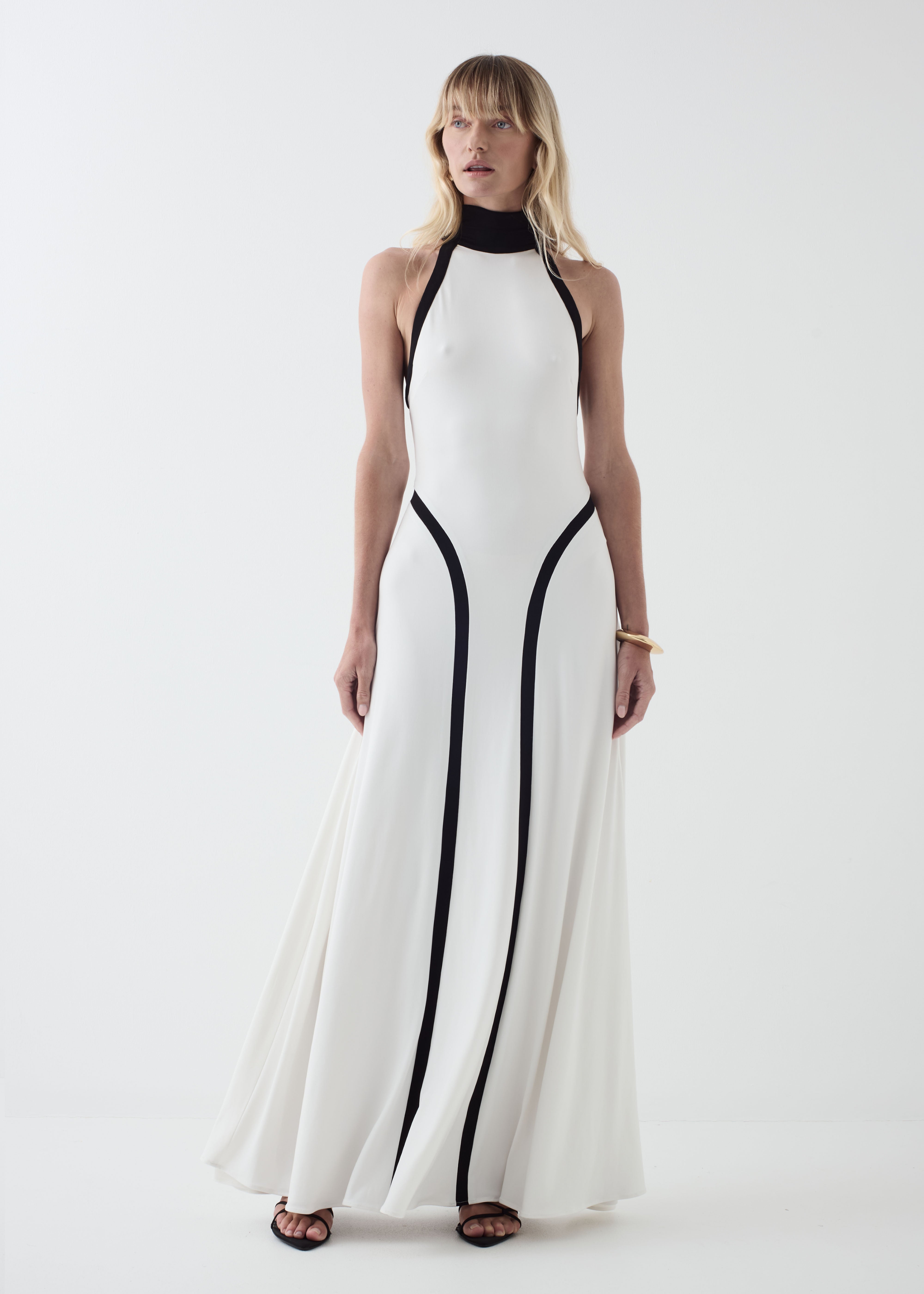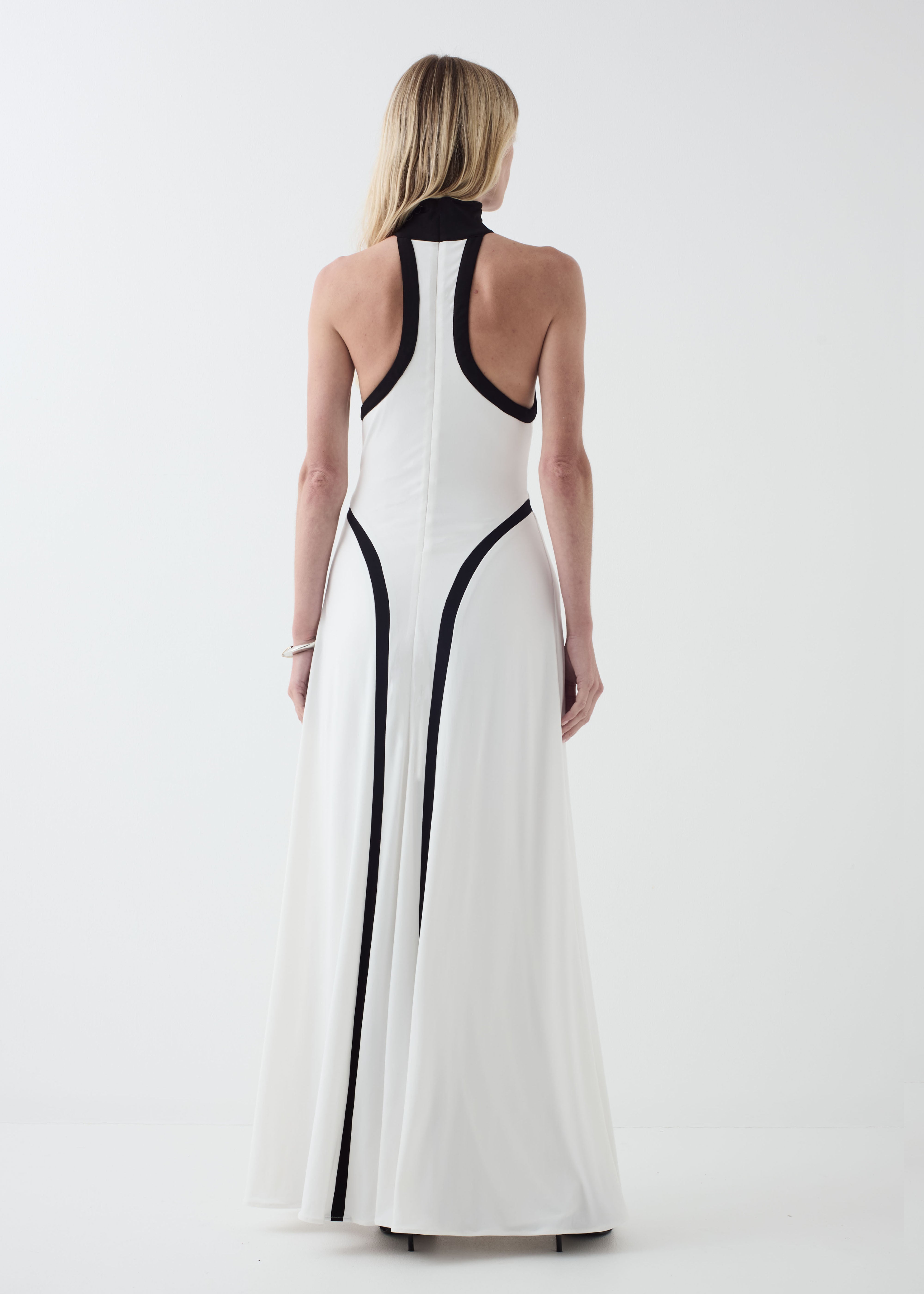Graphic lines define this modern halter silhouette. Designed with a high neckline and contrast paneling through the body, the dress skims the form before falling into a fluid, floor-length hem. Finished with a concealed back zip for a clean, sculptural finish. Fully lined for practicality.