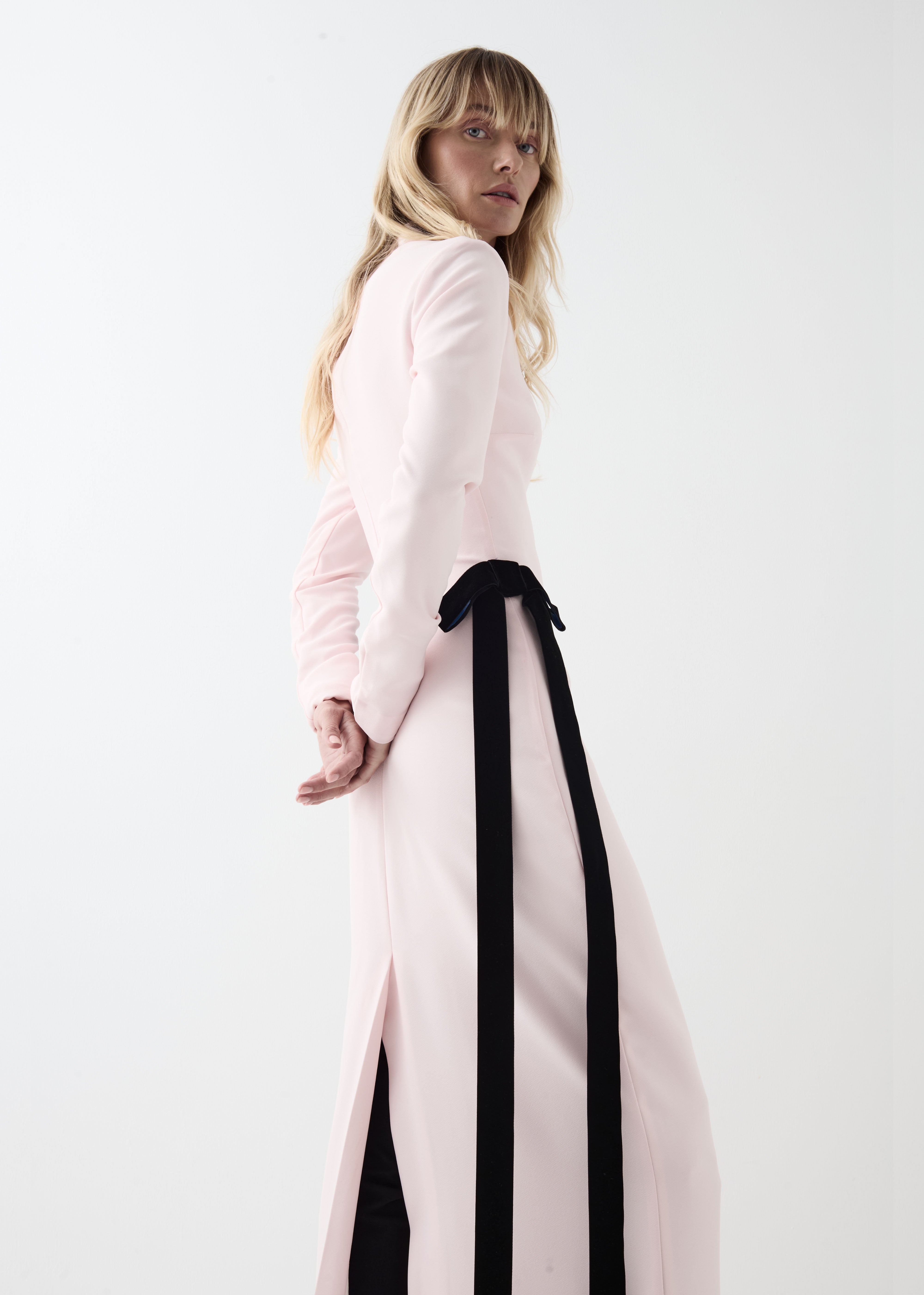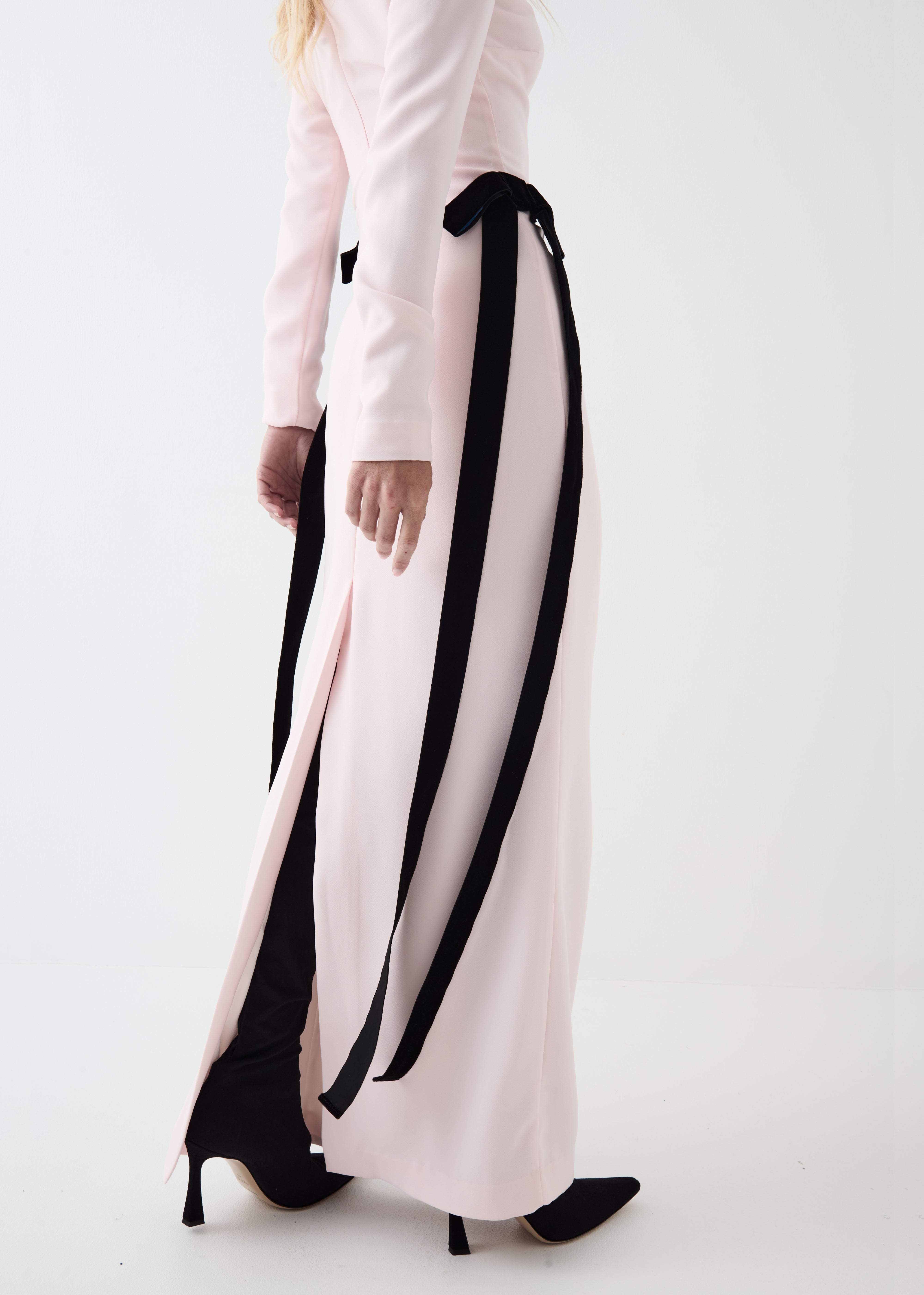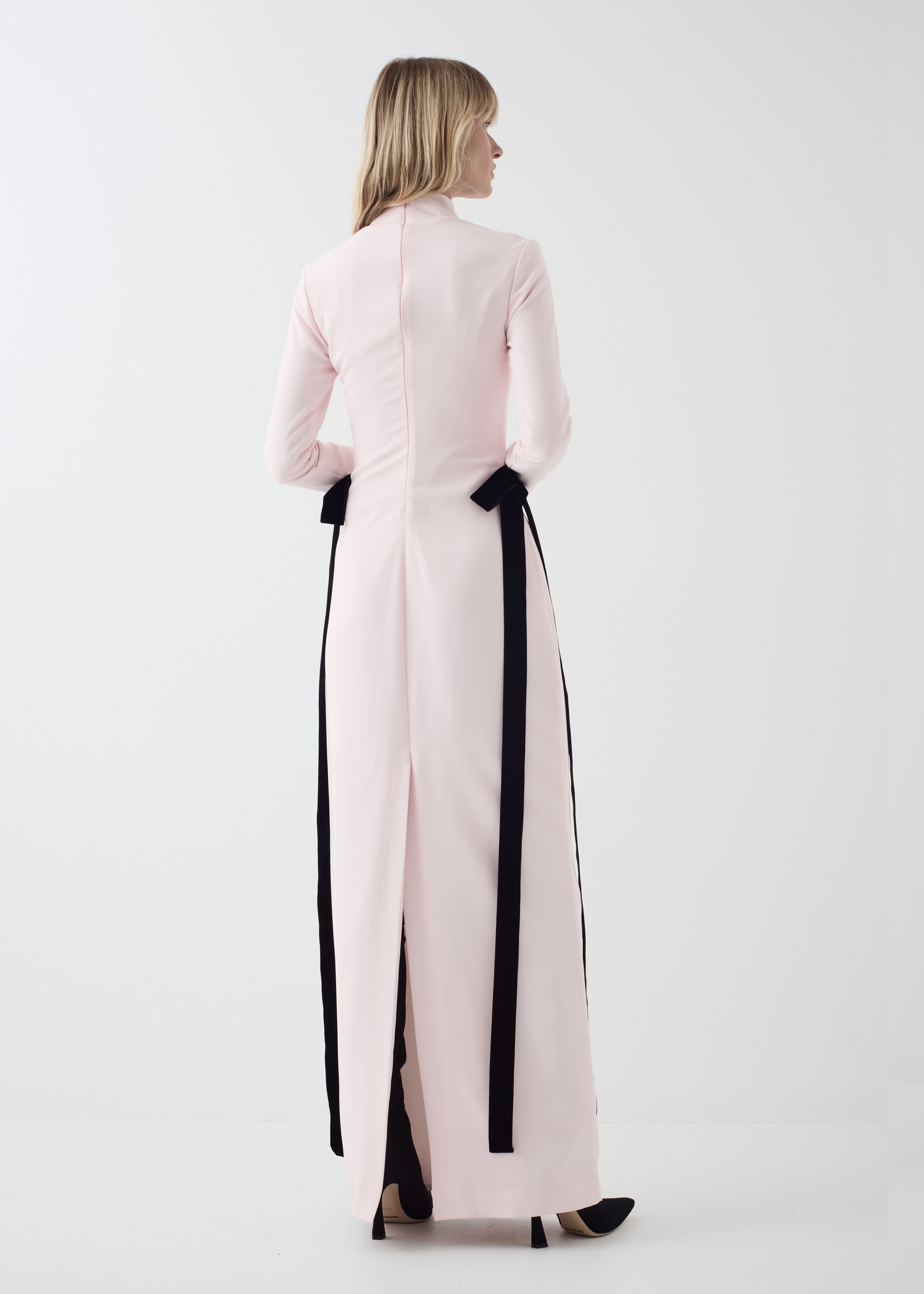 A sleek long-line silhouette is elevated through a high neckline and elongated lines. Designed to skim the body, contrasting black ribbon bow and ties at the waist introduce graphic definition against the soft blush tone. The floor-length cut creates a refined, uninterrupted form. Finished with a concealed back zip and rear vent.