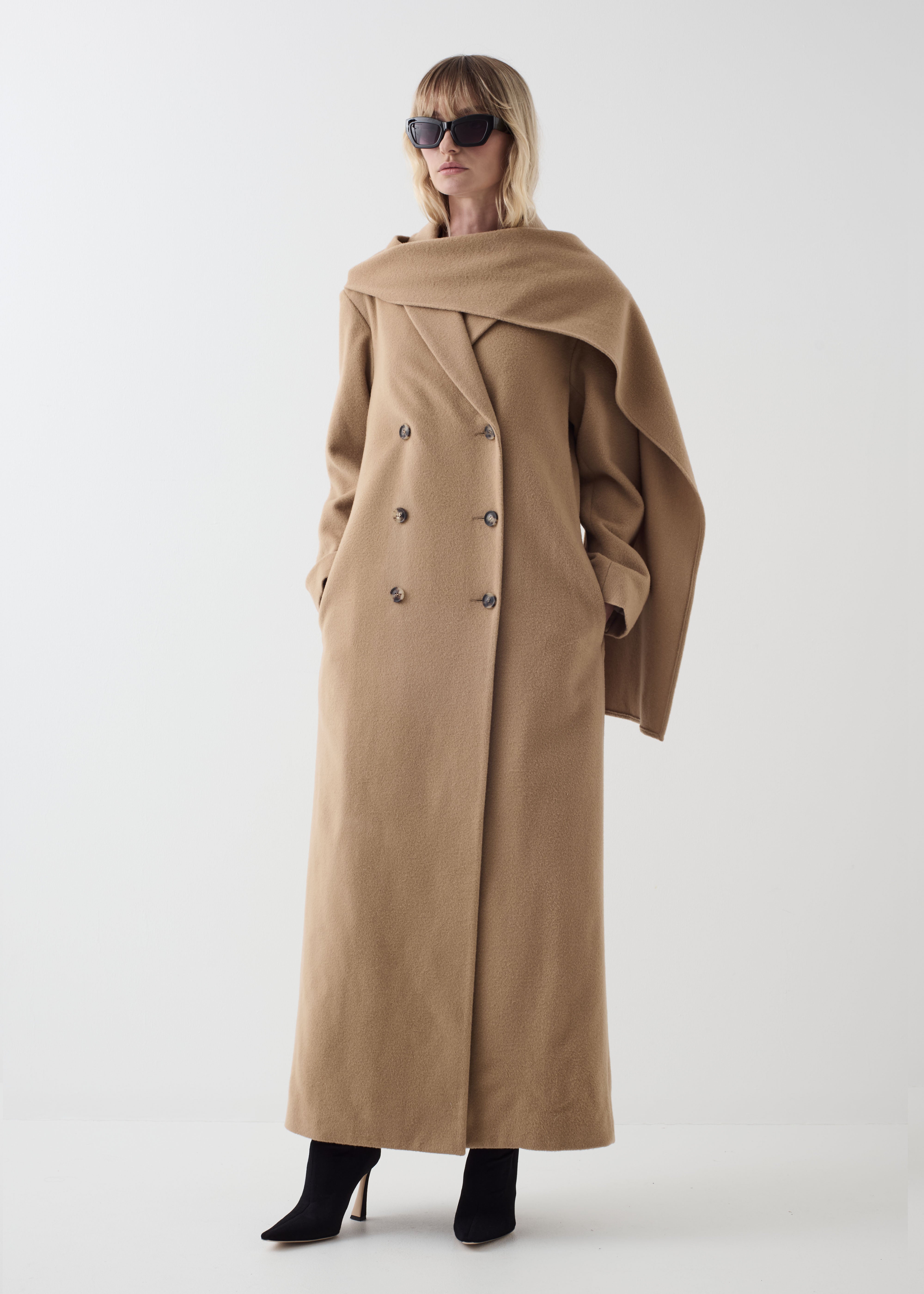 The seasons F&F signature coat takes cues from 90s outerwear in its oversized fit and elongated length made contemporary with statement scarf detailing and tortoiseshell buttons. Crafted in a wool-blend, fully lined in certified harmful chemical free lining with padded shoulders and concealed side pockets allow for ease of wear.