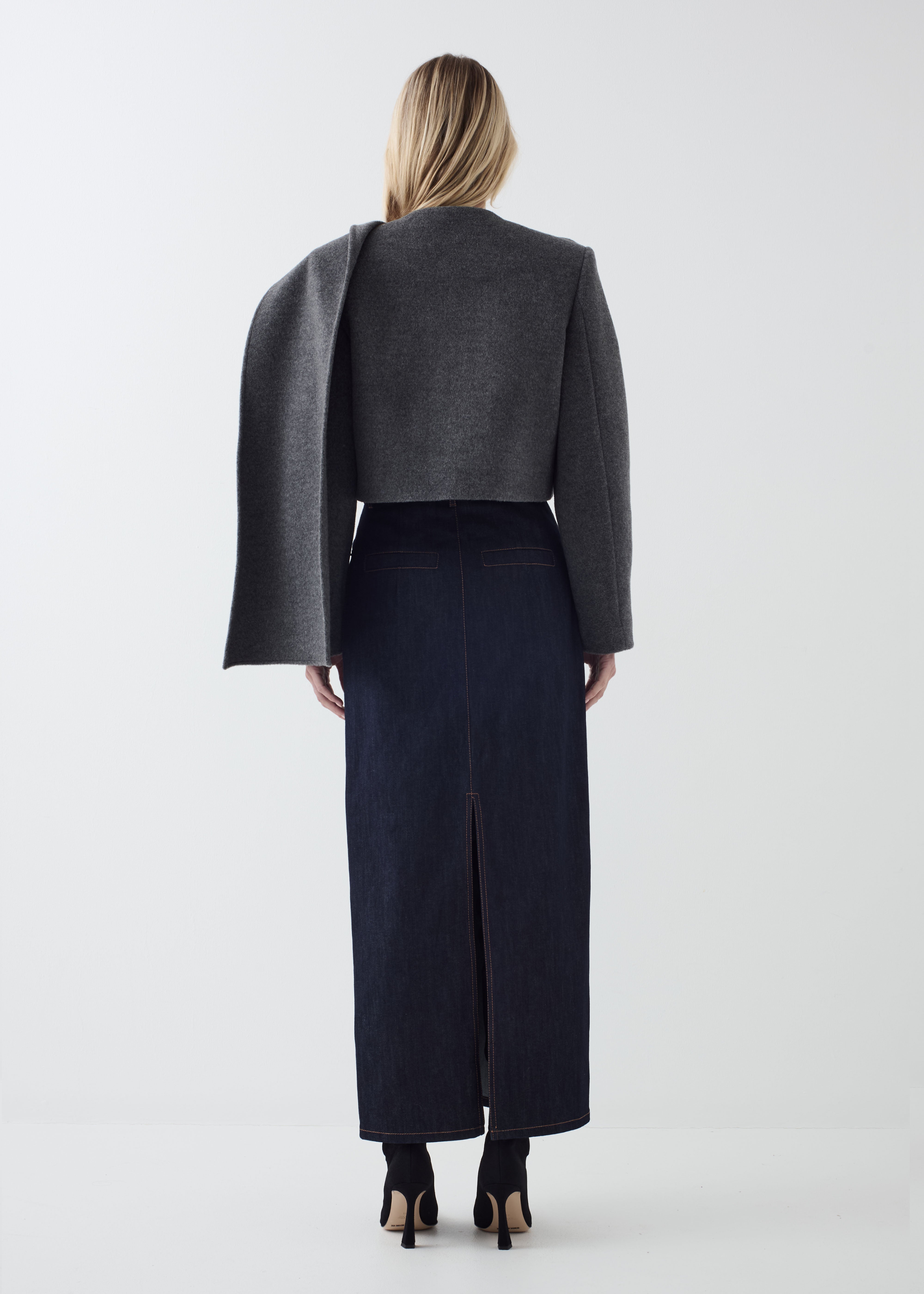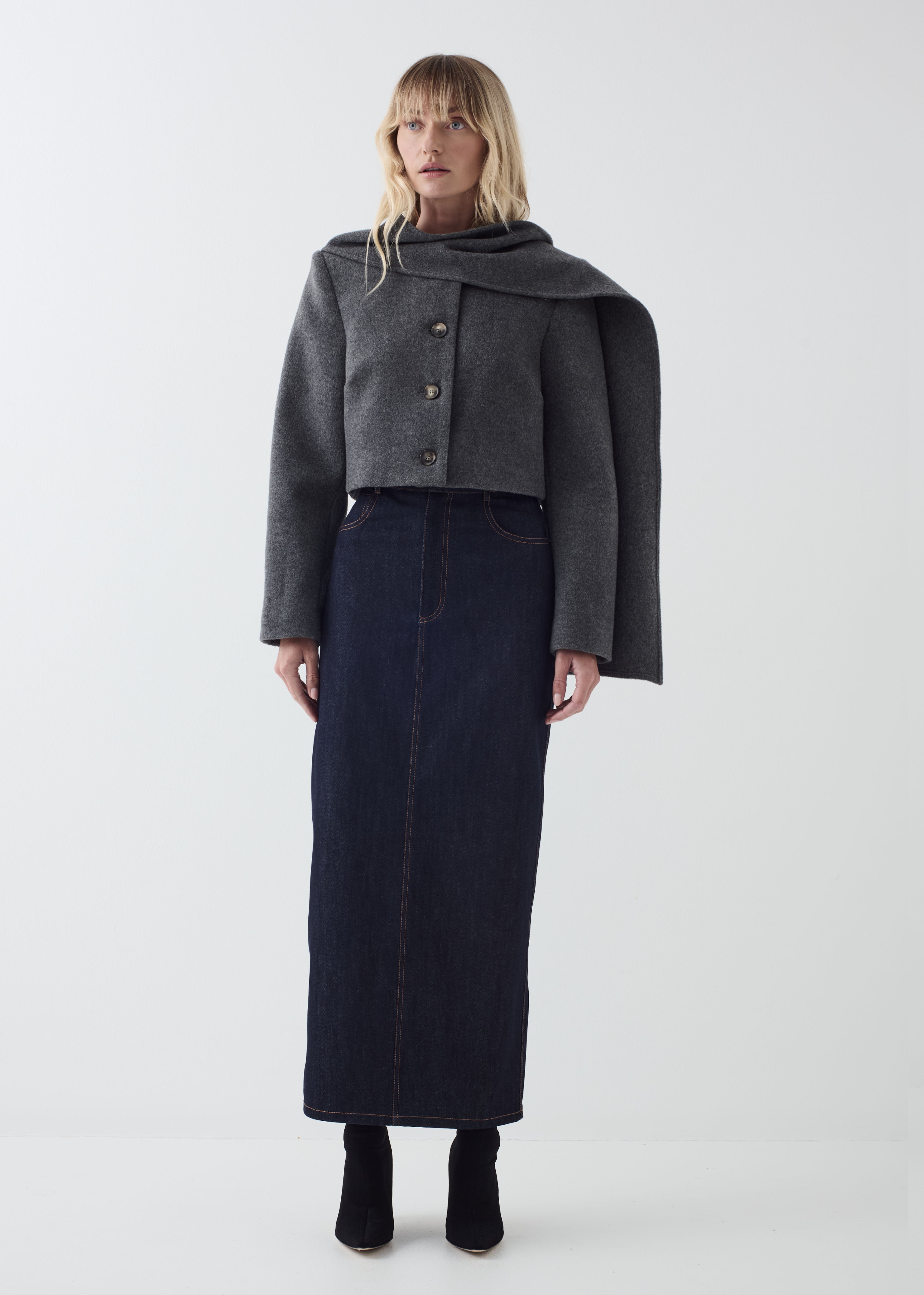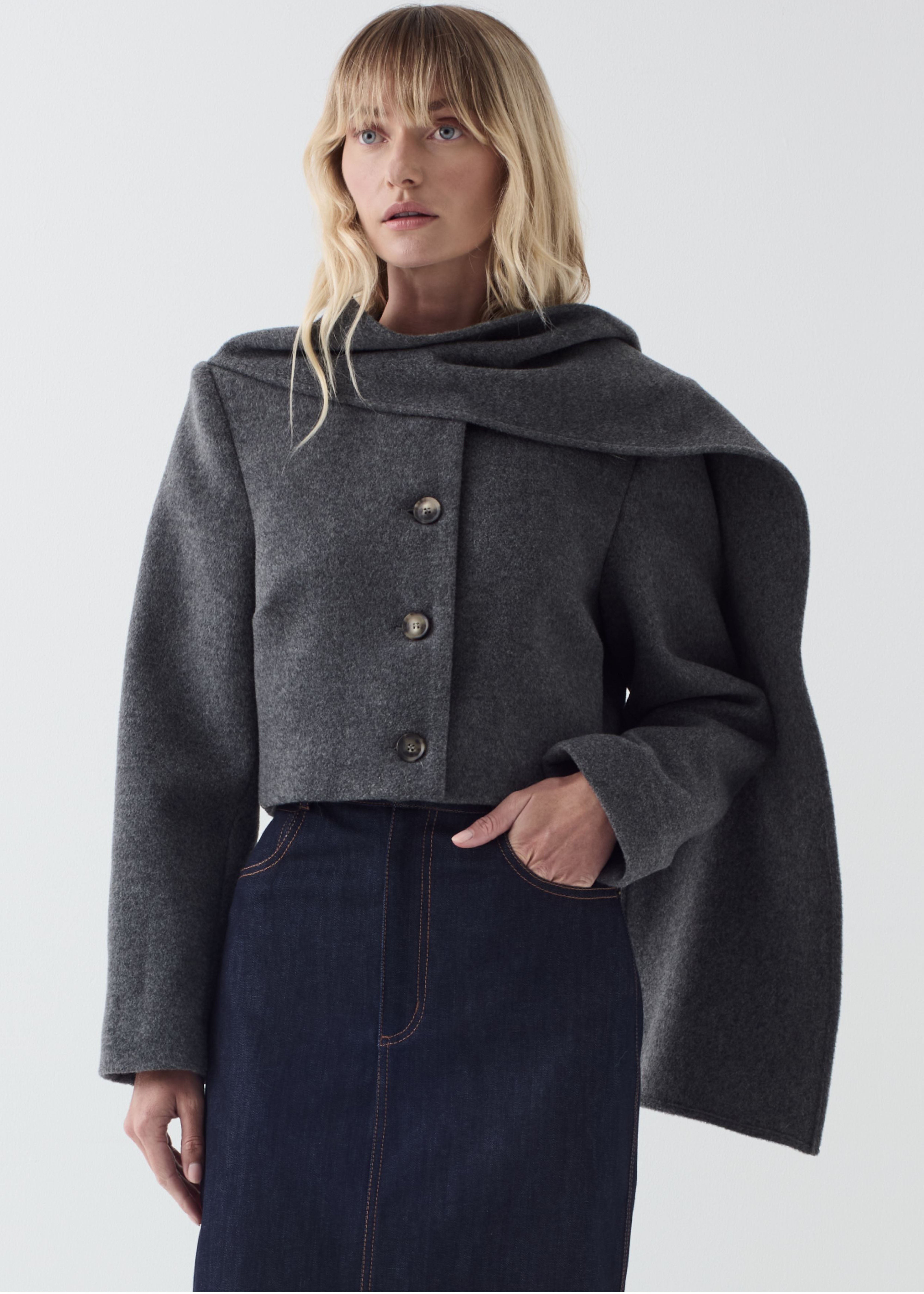 A statement scarf forms the feature of this elevated style. Crafted in a wool blend, a cropped length and strong shoulders lends itself to a purposefully boxy fit with lines kept minimal. Finished with subtle Italian tortoiseshell buttons and fully lined in certified harmful chemical free lining.