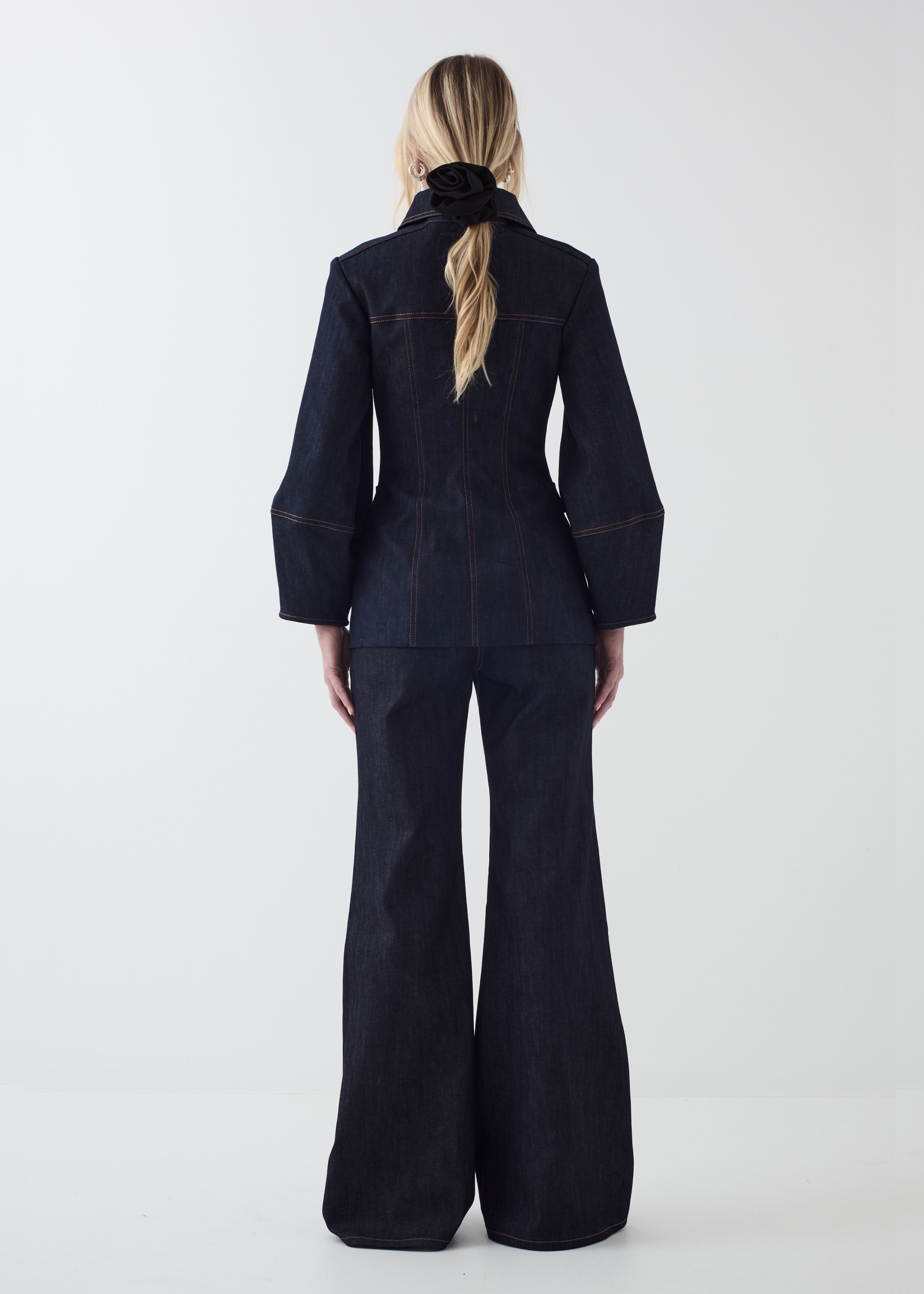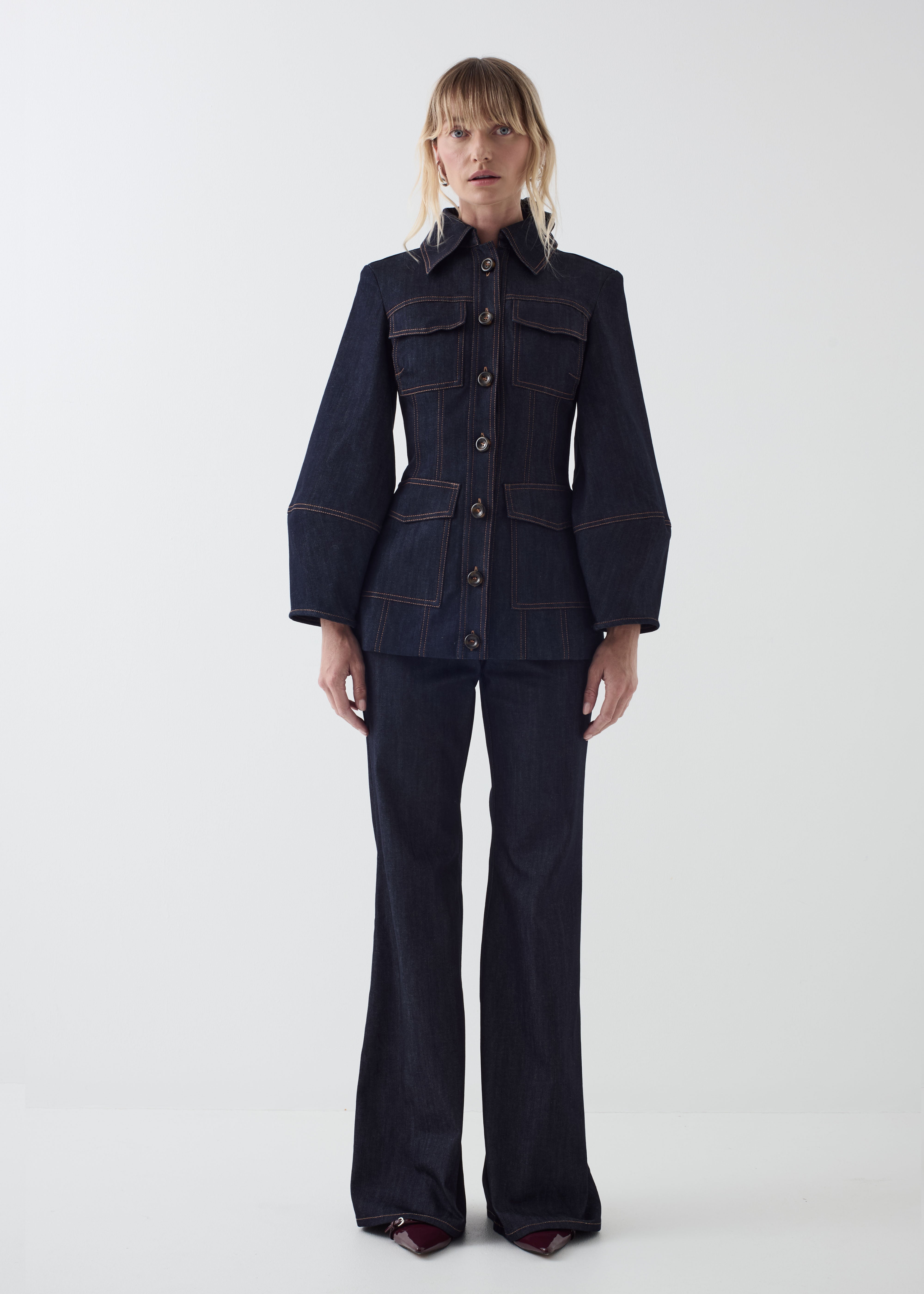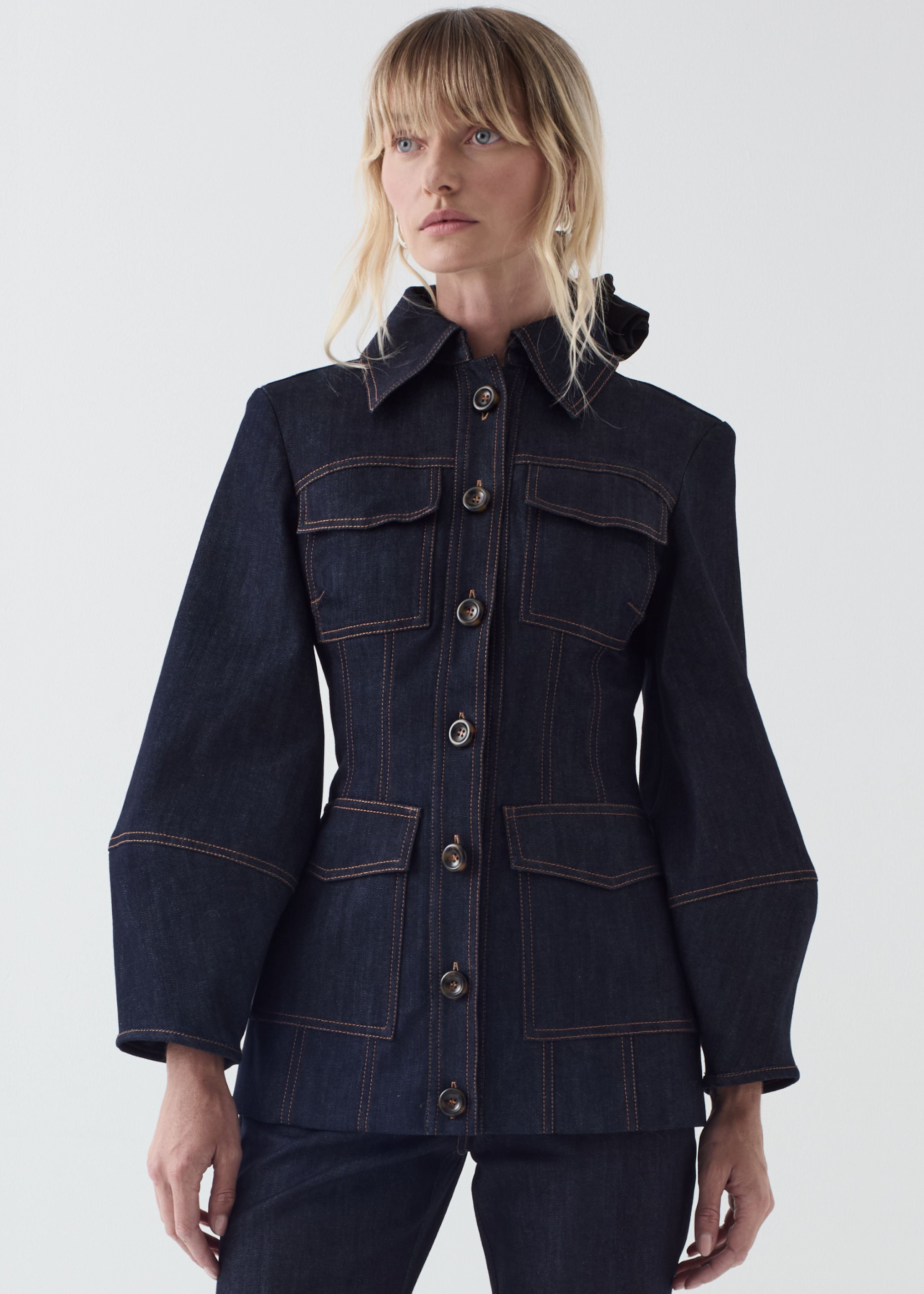 A utilitarian safari style jacket reworked in denim with romantic puff sleeves and corseting detail is intentionally sculpted at waist to accentuate the form. Pointed collar, sleek sleeve detail, Italian tortoiseshell patterned buttons, and full lining add further unexpected and refined elements.