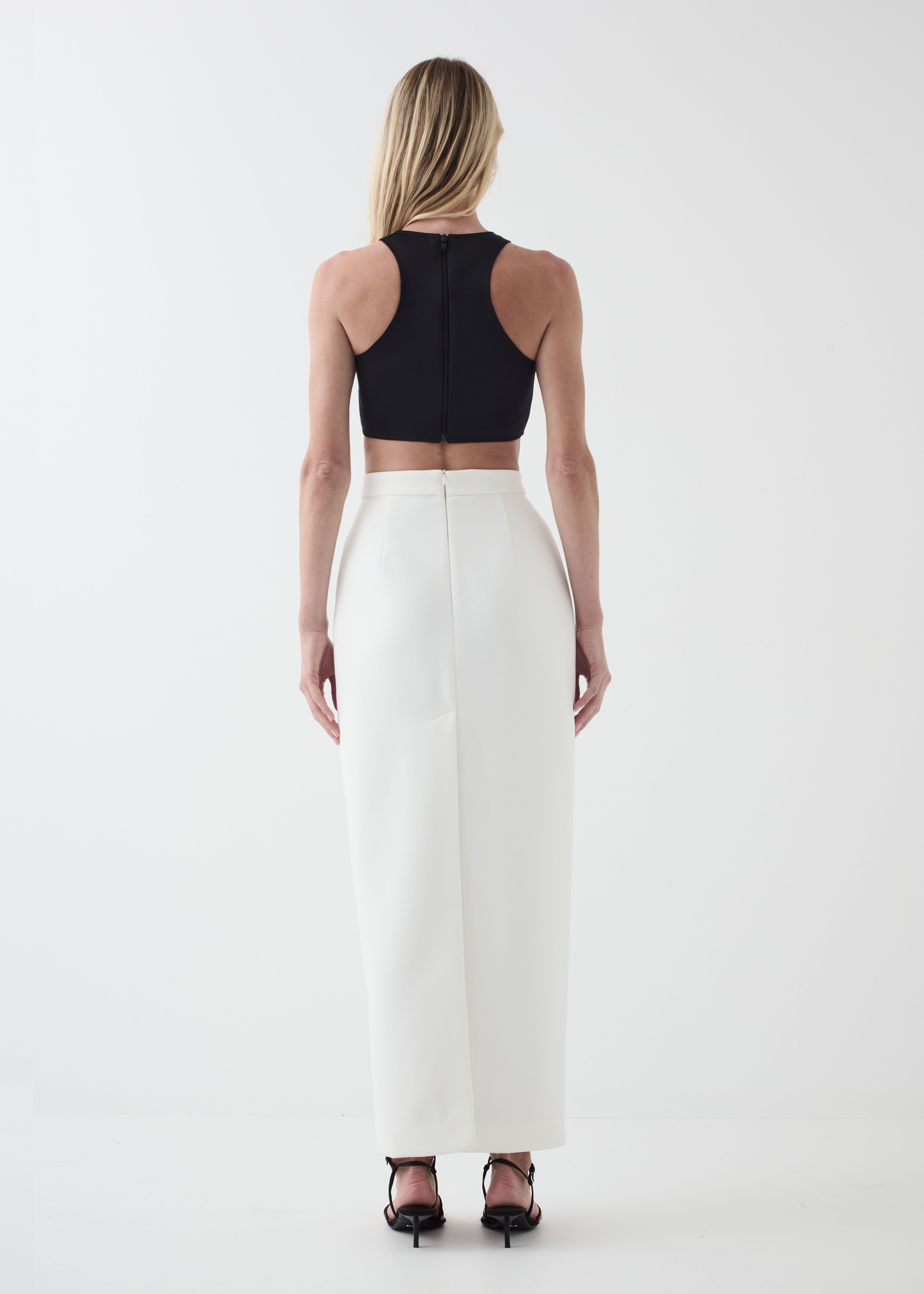 An athletic racer neck crop in a luminous double satin features a romantic yet modern curved hemline making this a statement piece. An open ended zip provides a clean and practical finish. Fully lined.