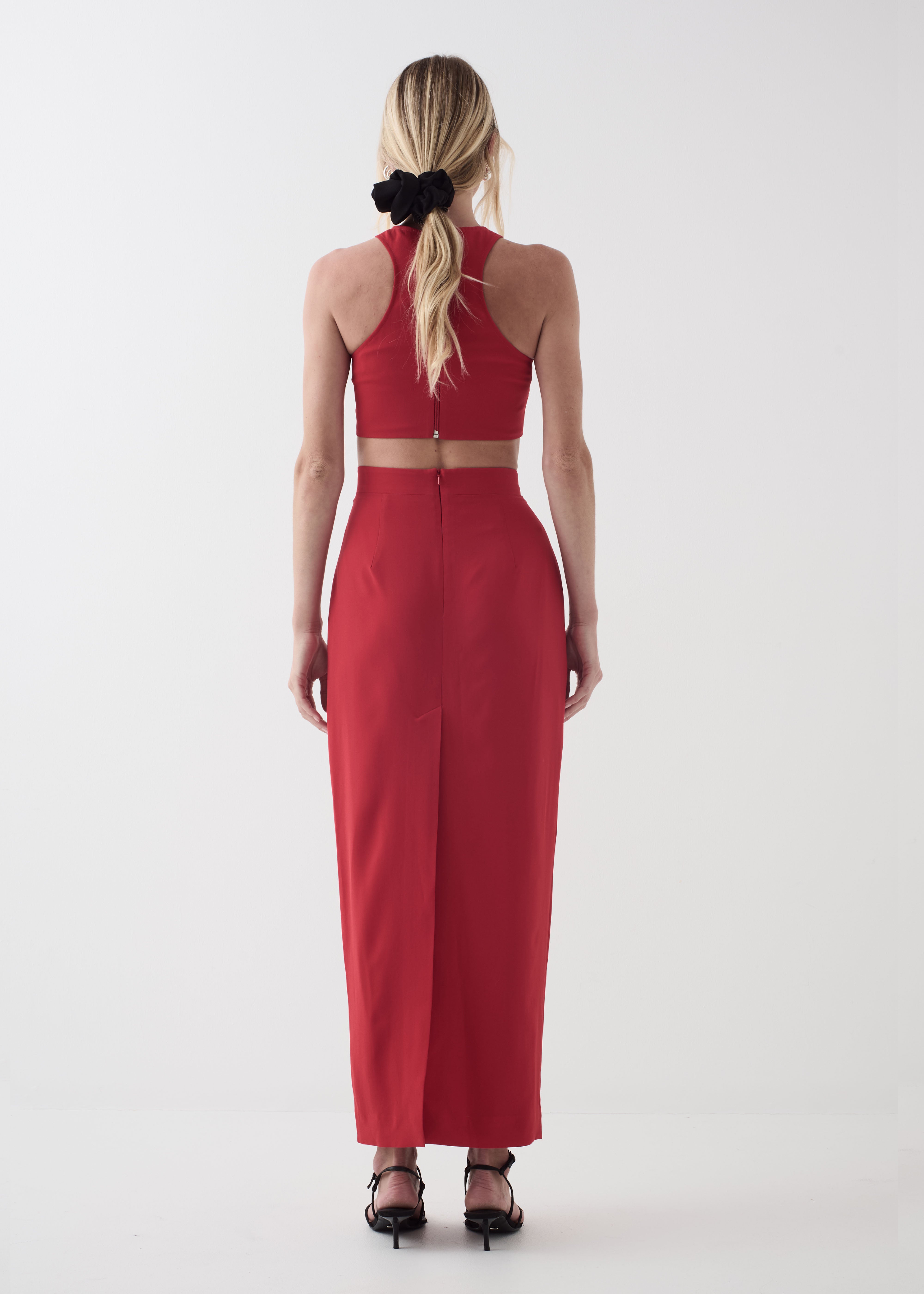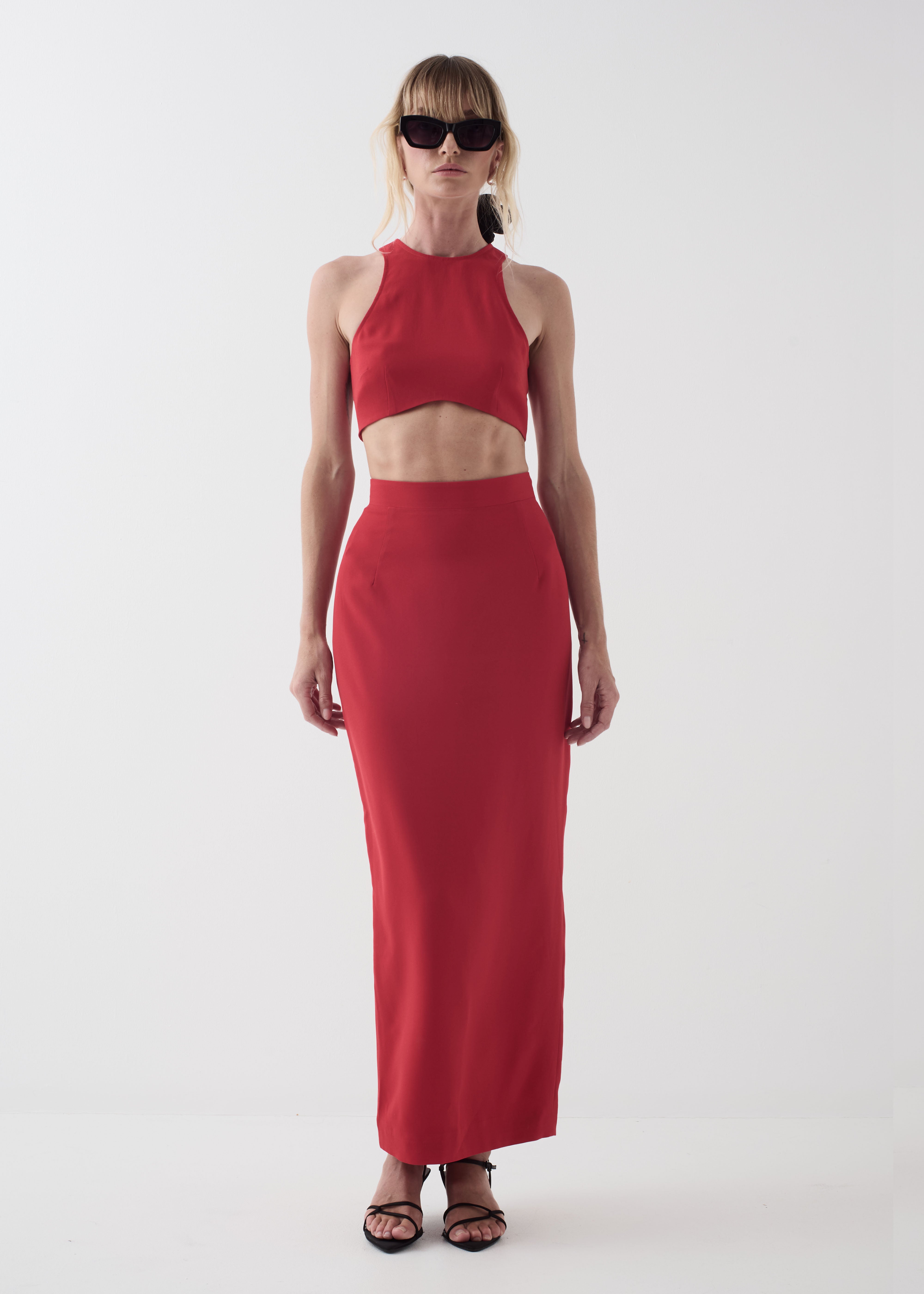 A scarlet red athletic racer neck crop with a romantic yet modern curved hemline makes this a staple wardrobe piece with a twist. Fully lined in harmful chemical free lining with an open ended zip for a clean and practical finish.